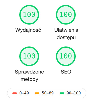 Monitorujemy parametry stron i systematycznie aktualizujemy kreator, aby wprowadzać nowoczesne rozwiązania. Dzięki temu strony osiągają wysokie wyniki w testach wydajności, takich jak Google Lighthouse, PageSpeed Insights, GTmetrix, i inne.