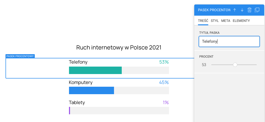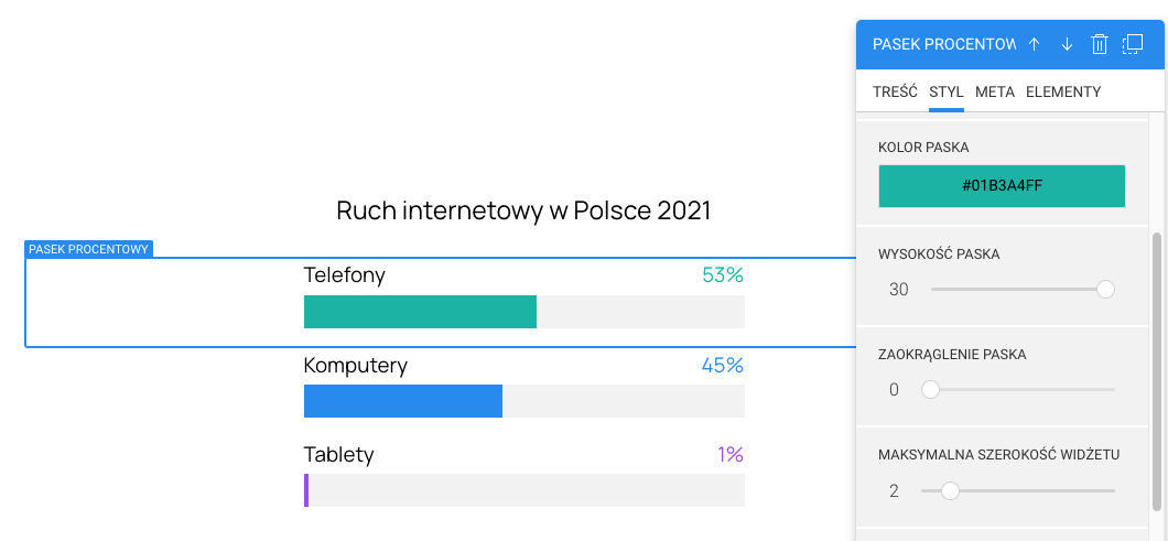 Widżet pasek procentowy pozwoli Ci na utworzenie prostych grafik pokazujących udział procentowy. Możesz je wykorzystać do prezentacji swoich statystyk.