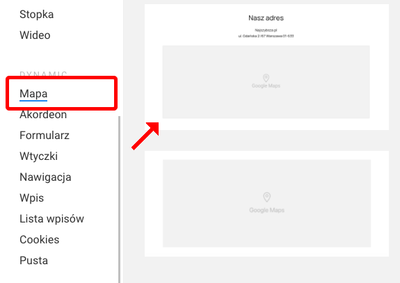 Dodaj do strony nową sekcję z biblioteki sekcji. Wybierz kategorię "Mapa" i wybierz wstępnie zaprojektowaną sekcję z mapą. Po dodaniu takiej sekcji możesz ją dostosować do stylu strony zmieniając jej ustawienia w inspektorze np. zmienić tło sekcji, teksty w sekcji i oczywiście adres jaki będzie pokazywany na mapie.
