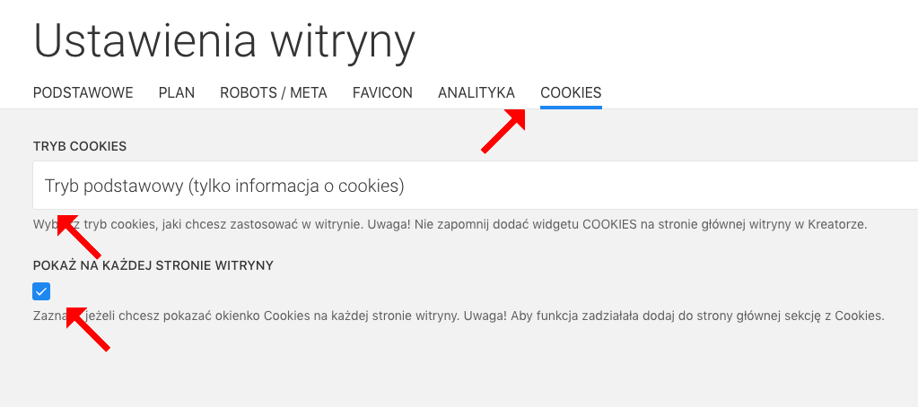 Przejdź do ustawień witryny do zakładki "Cookies" i wybierz tryb okienka cookies. Jeżeli chcesz pokazywać okienko na każdej podstronie witryny zaznacz flagę "Pokaż na każdej stronie". Zapisz ustawienia witryny.