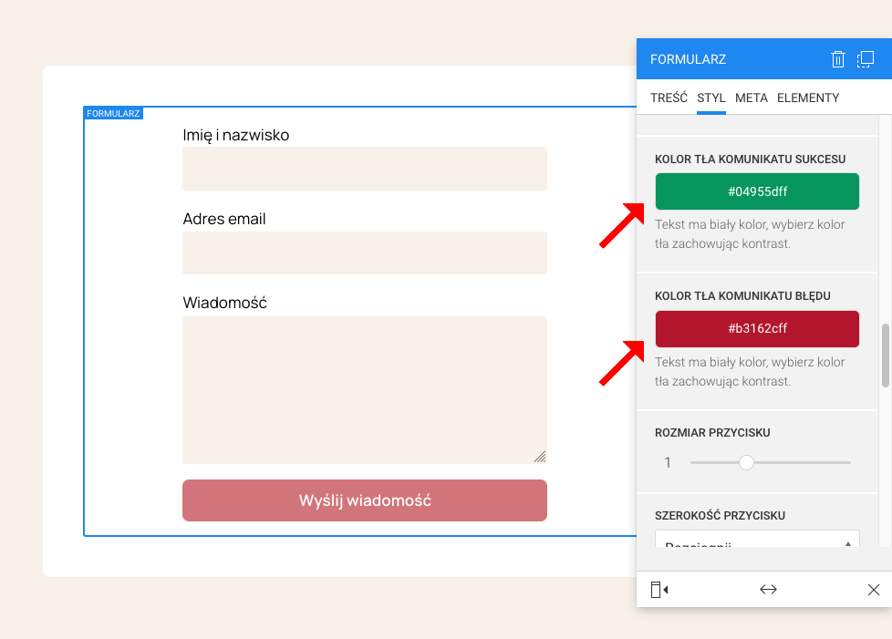 Komunikaty pojawiają się domyślnie na zielonym tle - w przypadku sukcesu lub czerwonym tle - w przypadku niepowodzenia. Aby zmienić kolory tła wejdź w ustawieniach formularza do zakładki "Styl" i zmień kolor pól "Kolor tła komunikatu sukcesu" oraz "Kolor tła komunikatu niepowodzenia". Pamiętaj, że kolor tekstu jest domyślnie biały więc tło powinno być odpowiednio ciemne aby zachować kontrast tekstu i tła.