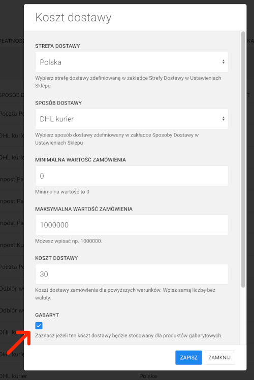 Jeśli oferujesz odbiór osobisty dla zwykłych produktów, a chcesz dodać taką opcję również dla gabarytów, musisz utworzyć osobny koszt dostawy.