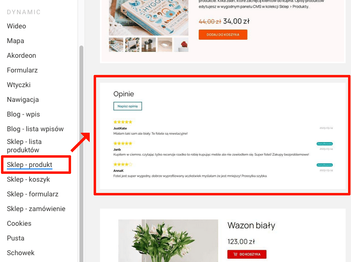 2. Dodaj do strony nową sekcję. W galerii sekcji w kategorii "Sklep-produkt" wybierz sekcję z opiniami produktów.