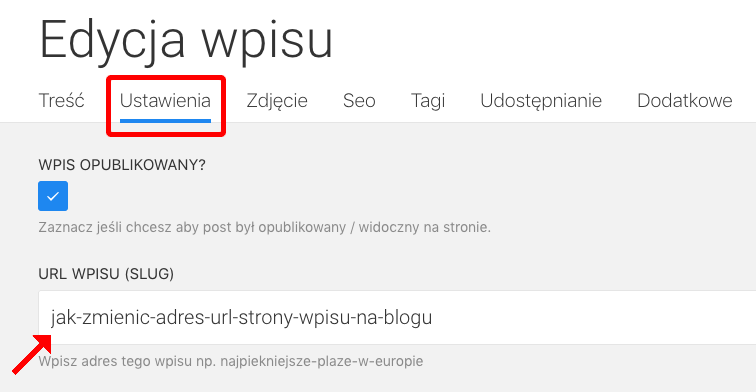 W adresie URL strony wpisu znajduje się unikalna część dla konkretnego wpisu tzw. Slug. Tę część możesz zmienić w ustawieniach wpisu.