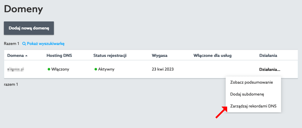 2. Na liście domen wybierz domenę, którą chcesz podłączyć i kliknij Działania > Zarządzaj rekordami DNS